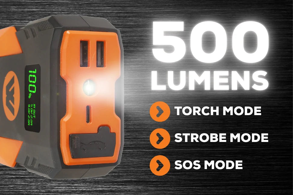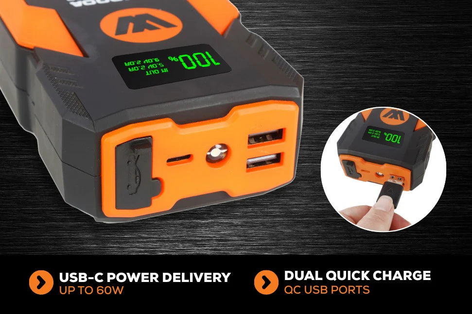 A 12,800 mAh internal battery delivers the power for up to 30 jump starts on a single charge.